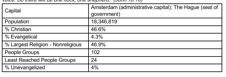 Christianity in the Netherlands has declined sharply from its strong history of missions and Christian influence. Today less than 10% attend church weekly, secularism dominates, and many church buildings are destroyed or repurposed. Catholic and Protestant churches face steep decline, but there are signs of hope through evangelical, charismatic, independent, and immigrant churches. Urban populations and growing Muslim communities present both challenges and opportunities for the Gospel, and the Dutch Caribbean islands remain largely nominal in faith.