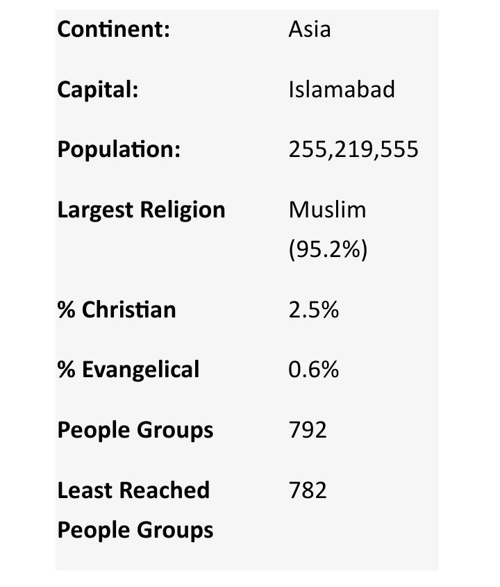 1. Pakistan is the world's second-largest concentration of unengaged, unevangelized peoples and the world's second largest Muslim population. Few countries, if any, present a greater challenge for missions. Pray for the calling of more intercessors, advocates and missionaries for these people in such hard places.
