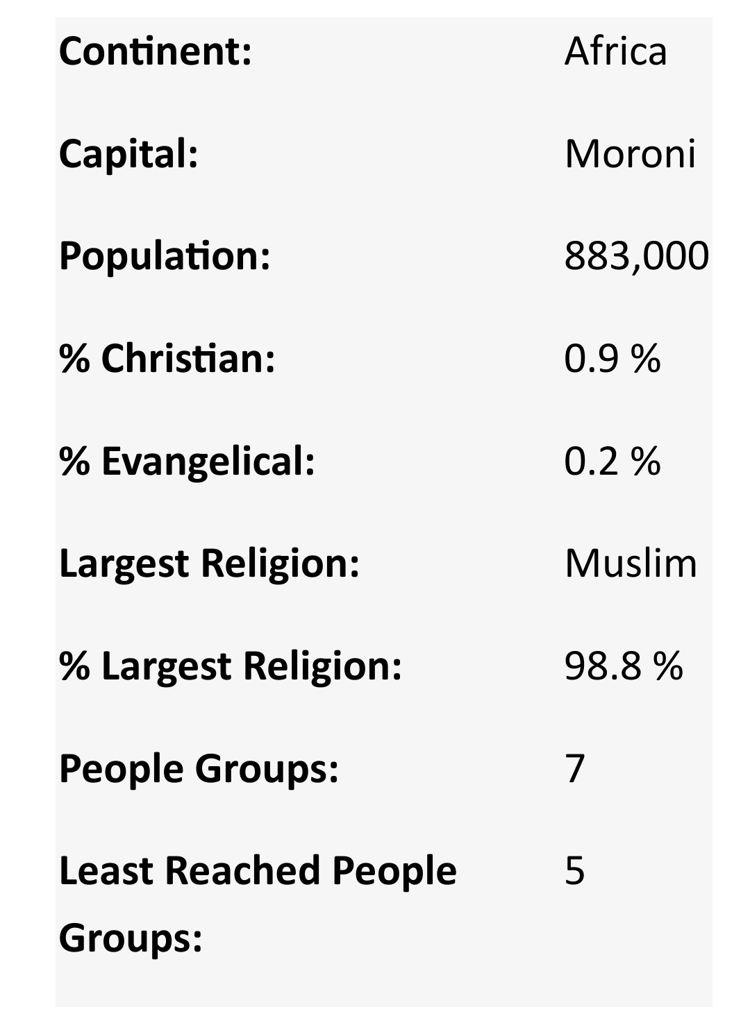 1. The vast majority of the population are Muslim. They were almost completely unevangelized before 1973. Islamic fundamentalism is on the rise. However, most are involved in occult practices through witchcraft, curses and spirit possession. Many young people - disillusioned with life in this society that offers so little hope - attempt to find solace in drugs, sex or the opportunity to leave the islands. Pray that they might have opportunities to hear the gospel of life that offers hope to all.